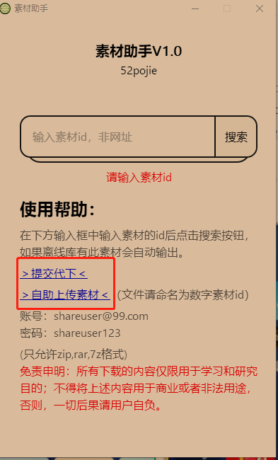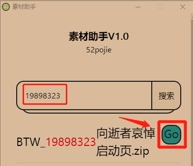 软件页面简洁,使用方法也很简单,大家解压以后,直接输入你要下载的素材id,点击搜索,然后点击GO,就能下载了。