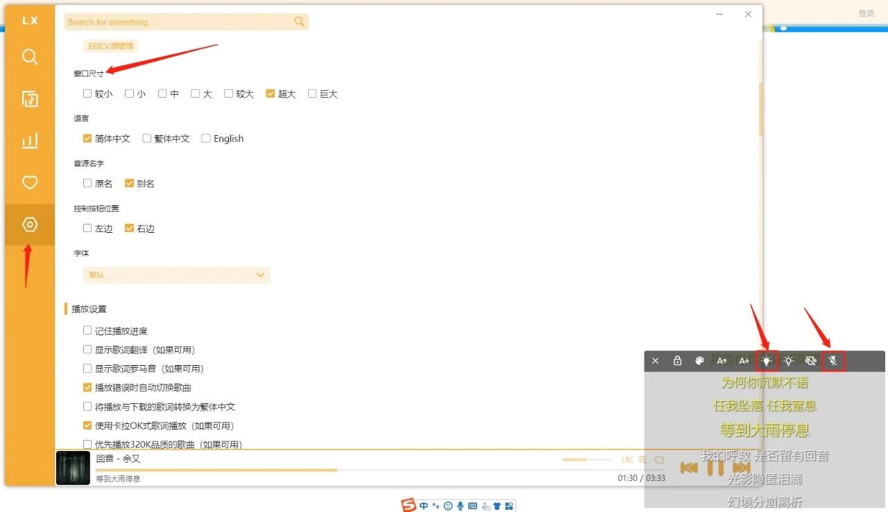 软件页面非常简洁,歌词功能做的非常美观,直接悬浮在电脑的右下角,还能进行透明度和歌词颜色调节,设置页面还能进行主题皮肤、歌词字体、窗口大小、全局快捷键等设置,它还有个强迫症设置(离开后清除文本框),太贴心了!