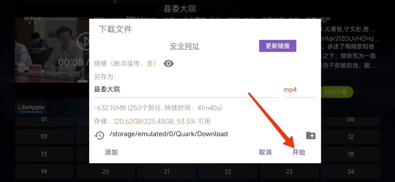 这时候大家打开tvbox,然后点击影视详情页面的idm下载,弹窗中什么都不用设置,直接选择开始,再返回idm软件中就开始缓存剧集了。