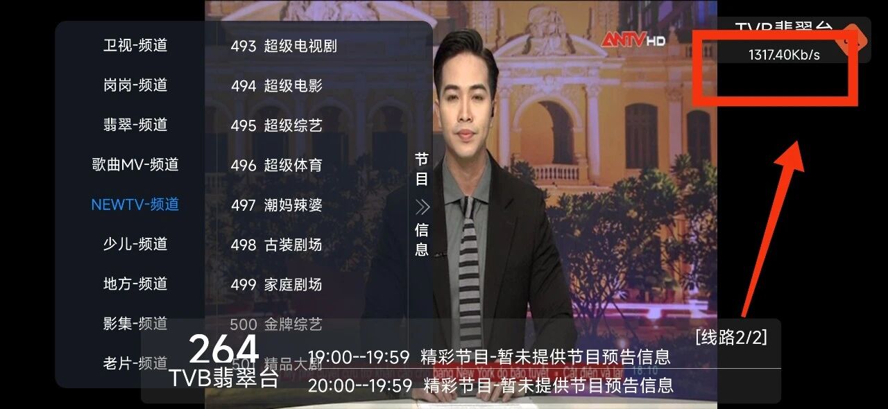 这次我们先看一下软件的电视直播板块,虽然还是用的旧版的壳子,不支持自定义直播源,但它内置了央视、卫视、sitv、岗奥苔、世界、地方、newtv、风景、轮播,真的很全,尤其是J②频道和面b频道,缓冲速度能达到8/900kb/s(看图)。