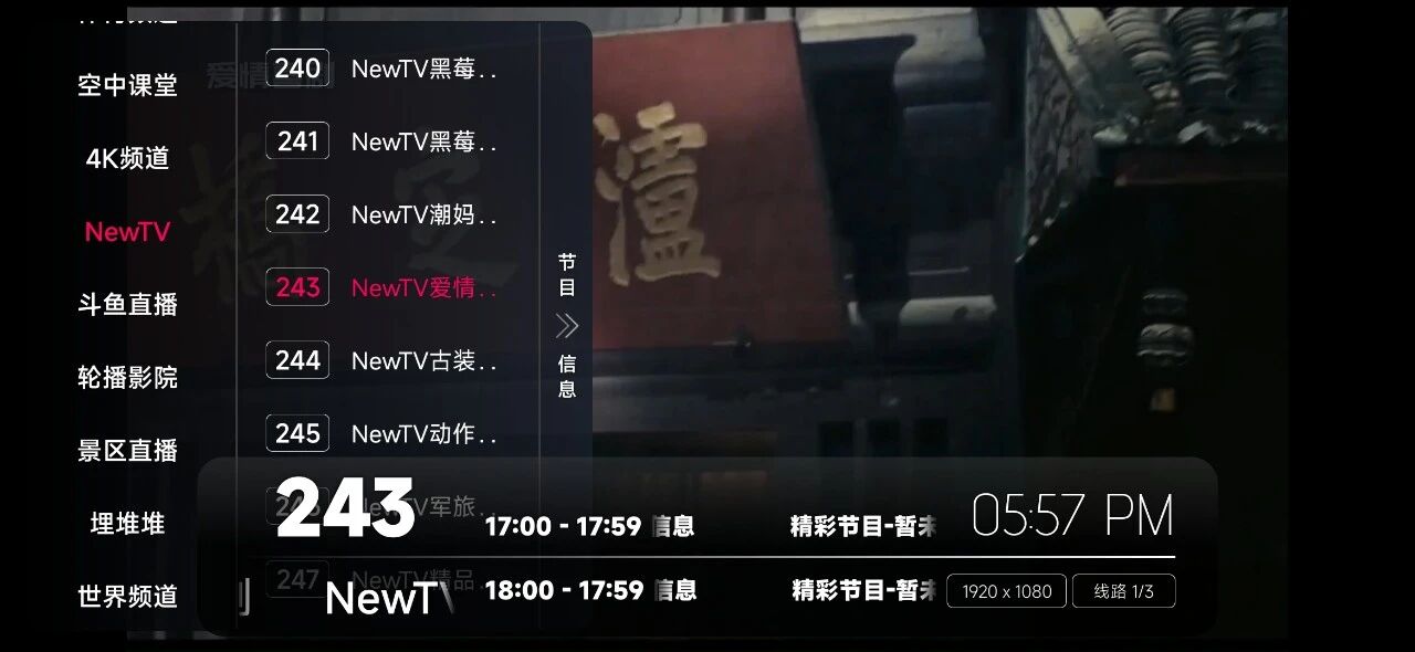 频道数量也是非常齐全,央视、卫视、景区、岗奥苔、轮播、newtv、世界、电台和女团都有,画质也是蓝光级别的,每个频道还有节目单页面。