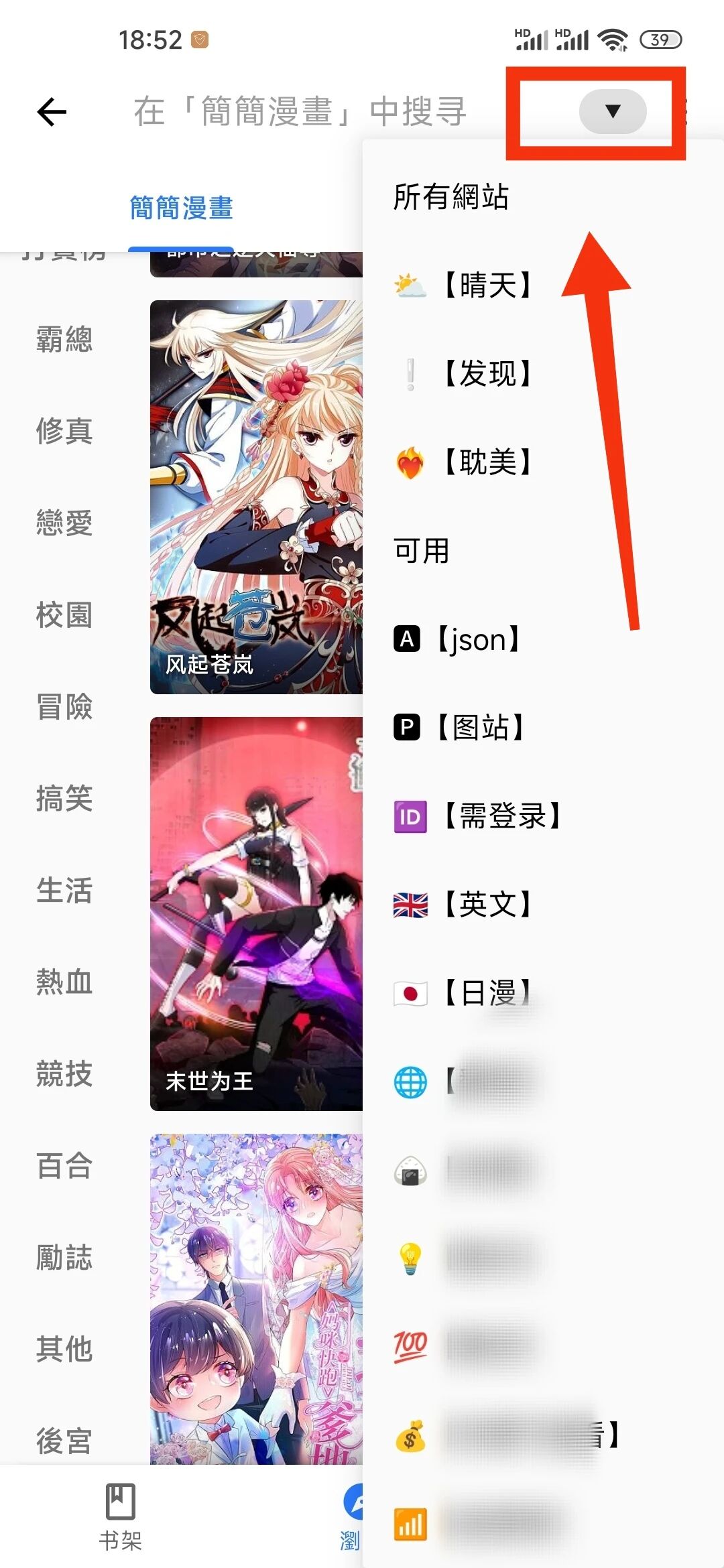 每个漫画源都有海量的资源,玄幻、科幻、穿越、历史、热血、都市等等,有的源还有老司机分类哦,而且大家在搜索漫画的时候,还能点击这个三角符号,就能筛选出免费不需要登录的源了。