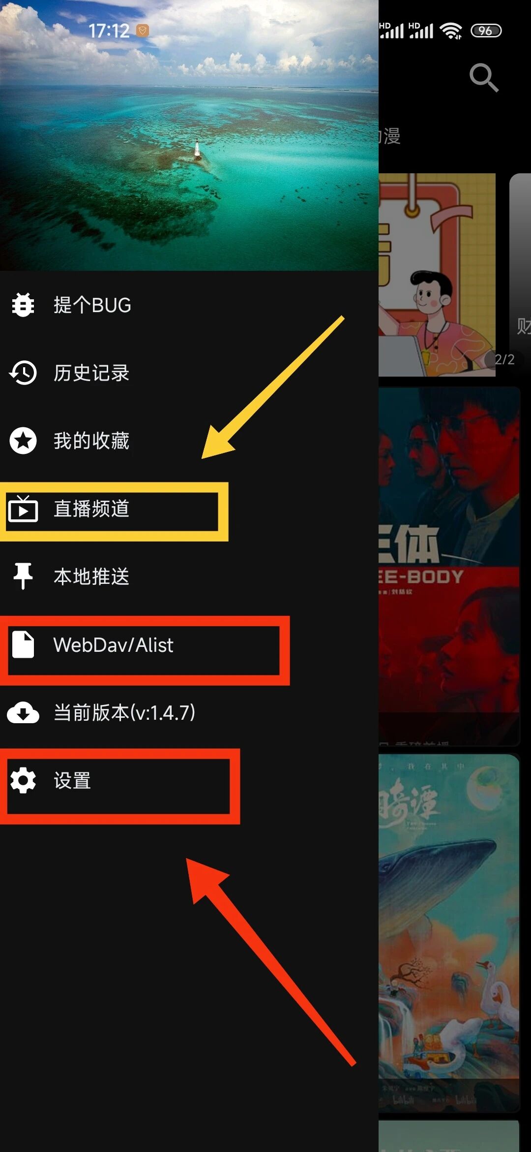 需要小伙伴们,注意的是,侧边栏里的直播频道就是电视直播入口,同时也支持挂载webdav/alist网盘功能,再看一下设置页面中的各种开关按钮,可以说跟TV端的TVbox几乎不差什么!
