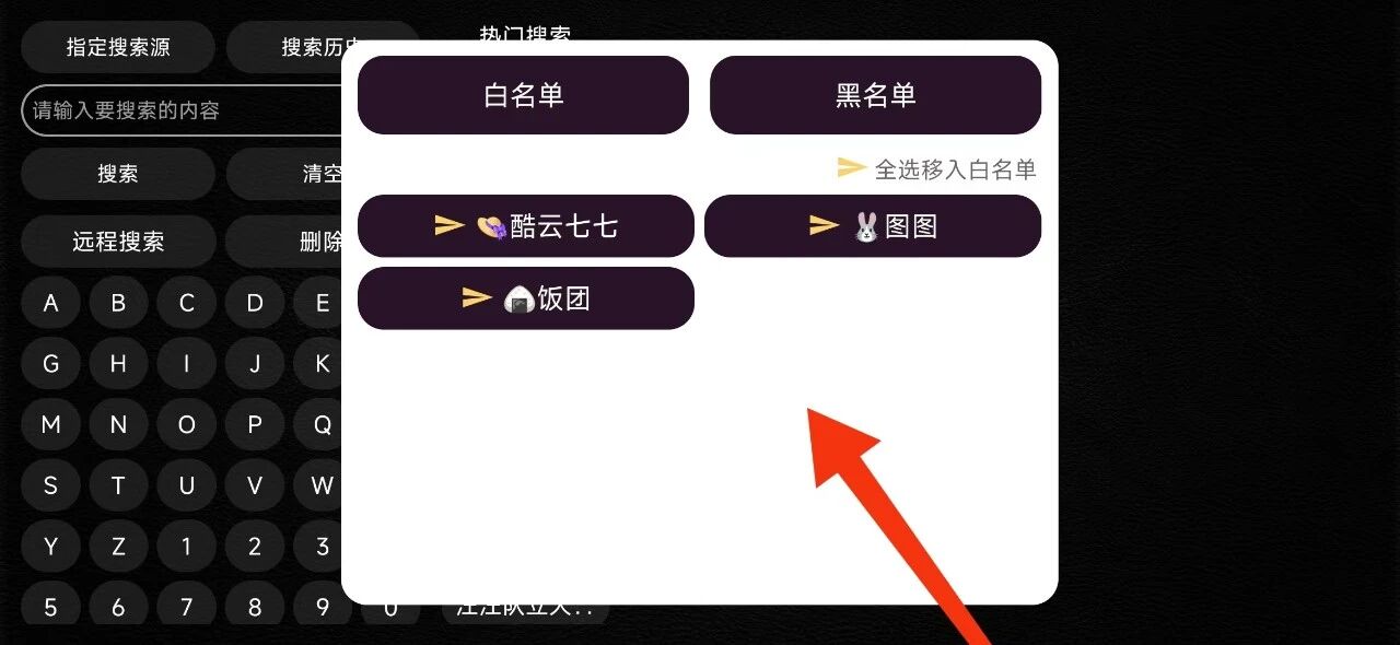 最新版本主要是修复了一些bug报错,然后就是这个指定搜索源页面,点击一下就自动移动到黑名单中,反之同样。