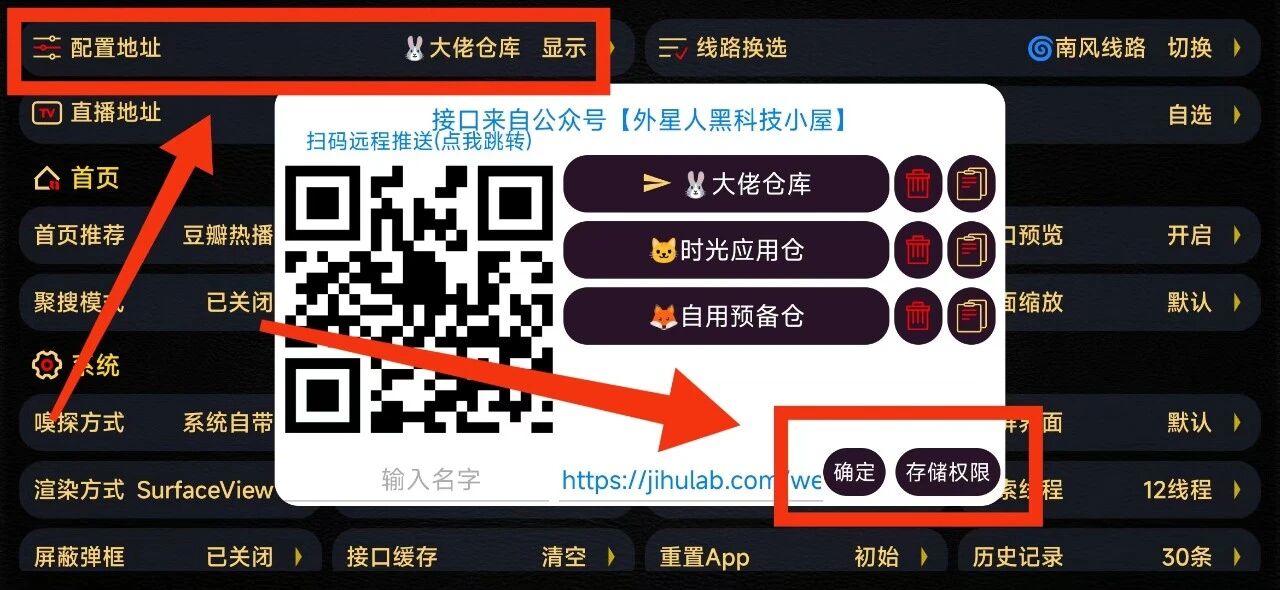 软件UI界面是金色字体,看着还不错,还有就是首次安装tvbox软件的小伙伴们,一定要在设置页面–点击配置地址,获取储存权限后,然后再点击一下确定,随后大家选择好仓库,线路就能使用了!