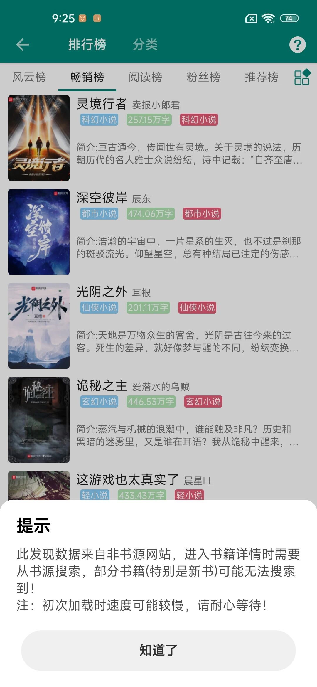 调用官方的数据源接口有个好处就是书荒找书好找点,不需要再去切屏了了,主要是排行榜、网络小说分类,当然一些其他平台上的小说,也可以通过搜索功能找到(书架页面右上角)哦!