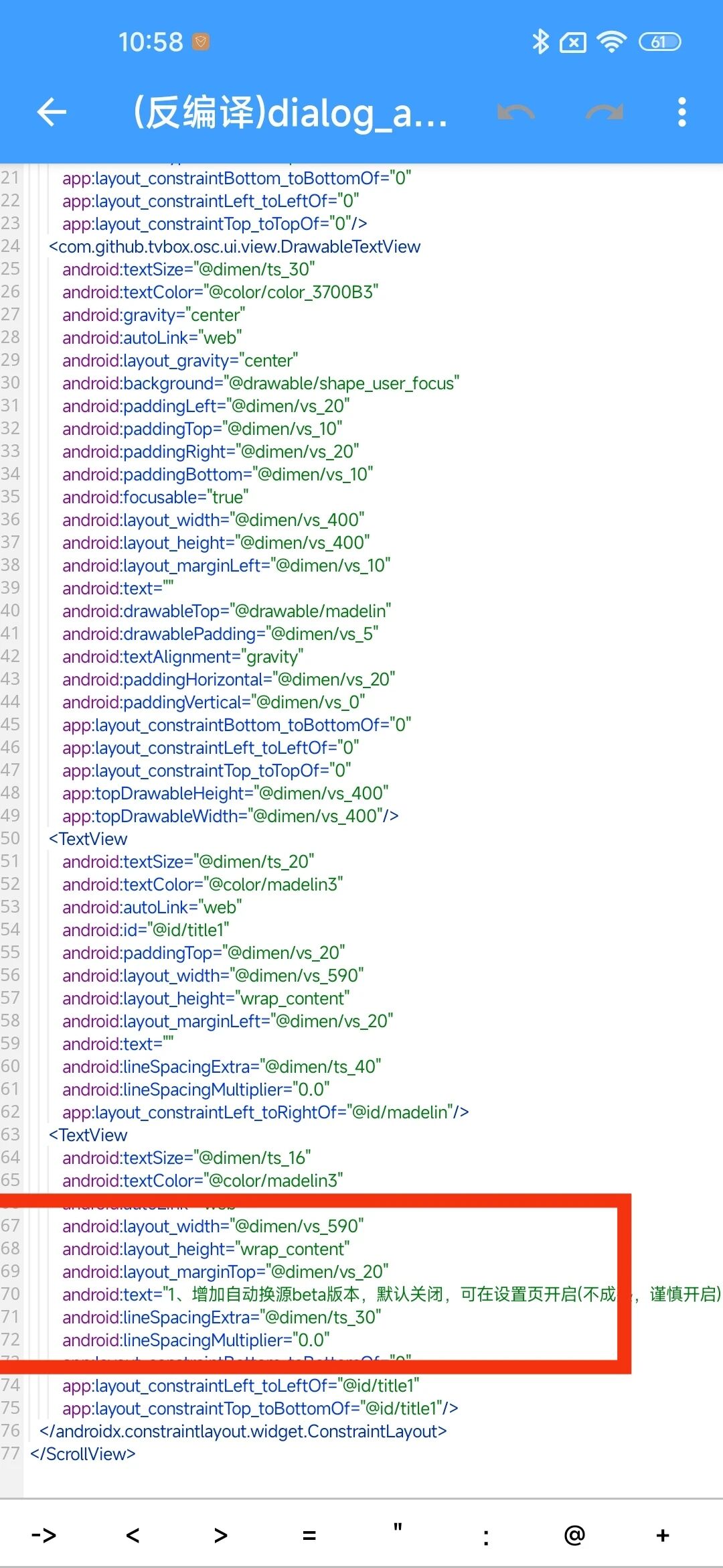主页上的“时光爱分享”,可以在dex文件中搜索修改;关于页面中的介绍则是在res文件夹—layout文件夹—dialog_about.xml中中修改,大约在70行;推送页面则是在res文件夹—raw文件夹—index.html文件中修改。