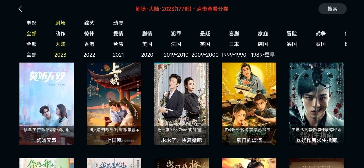 在顶部有,剧场、影视、综艺、动漫四个板块,点击后,就会进入资源库页面了,类型、时间、地区各个筛选标签都有。