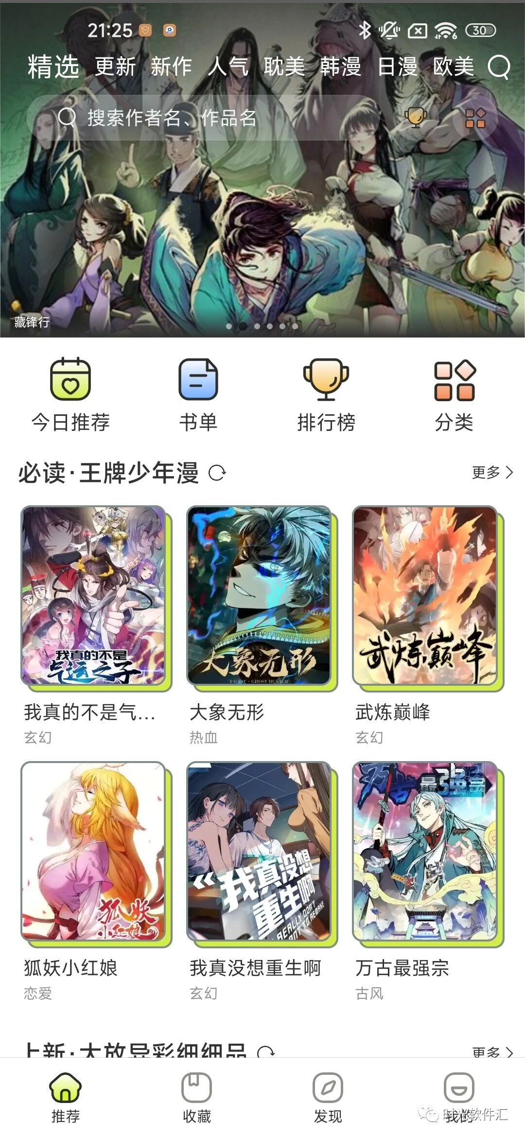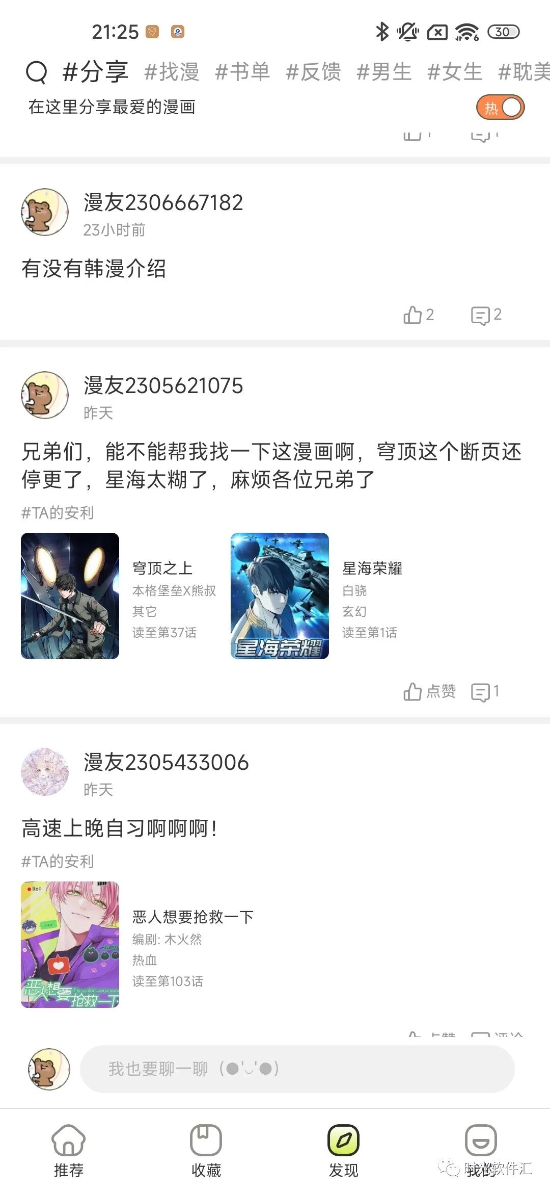 在软件底部还有发现板块,你可以在这里找漫画、求漫画等等。此外,软件的阅读器功能做的也很不错,UI界面非常美观,阅读模式、评论、收藏、缓存等功能都有!